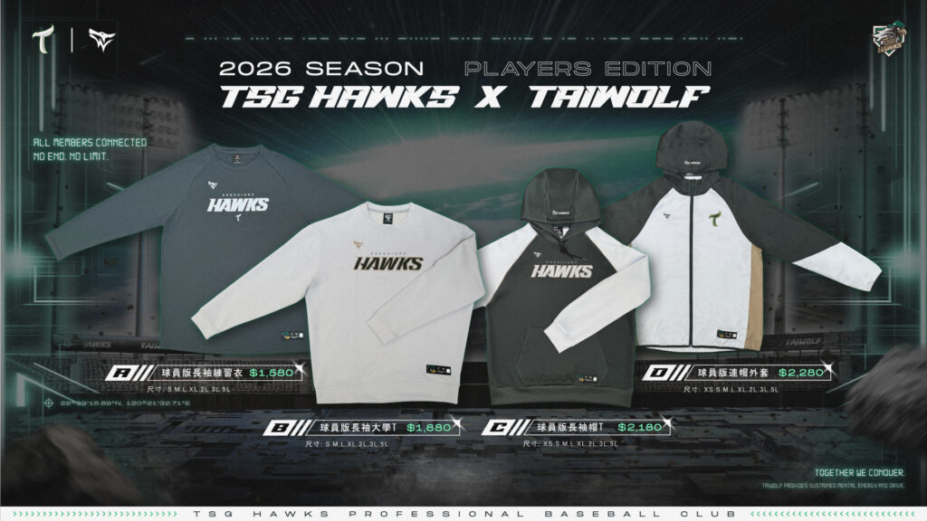 依熱銷度依最新項目排序依價格排序:低至高依價格排序:高至低 View:1224All 快速預覽 快速預覽2026球員版, TSG HAWKS x TAIWOLF, 上衣類2026台鋼雄鷹XTAIWOLF球員版長袖帽T NT$2,180選擇規格 快速預覽 快速預覽2026球員版, TSG HAWKS x TAIWOLF, 上衣類2026台鋼雄鷹XTAIWOLF球員版長袖大學T NT$1,880選擇規格 快速預覽 快速預覽2026球員版, TSG HAWKS x TAIWOLF, 上衣類2026台鋼雄鷹XTAIWOLF球員版連帽外套 NT$2,280選擇規格 快速預覽 快速預覽2026球員版, TSG HAWKS x TAIWOLF, 上衣類2026台鋼雄鷹XTAIWOLF球員版長袖練習衣 NT$1,580選擇規格
