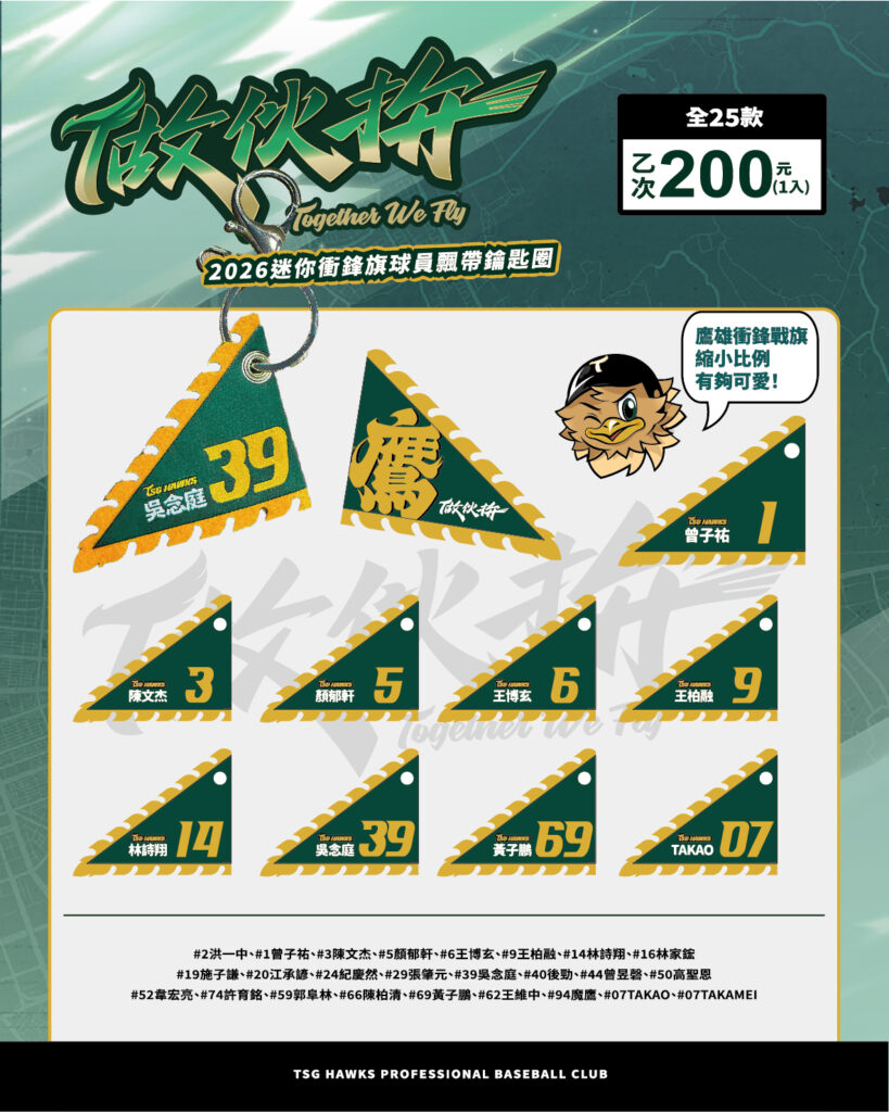 【🦅2026迷你衝鋒旗球員飄帶鑰匙圈扭蛋 】 把應援掛在身上,隨時隨地為台鋼雄鷹加油! 將球場的應援日常,化身為迷你衝鋒戰旗,搭配球員專屬背號,快來抽出你想大聲喝采的球員🔥