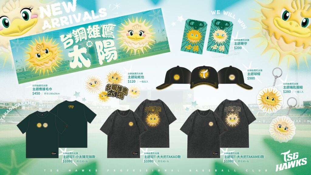 依熱銷度依最新項目排序依價格排序:低至高依價格排序:高至低 View:1224All 快速預覽 Out of Stock 快速預覽台鋼雄鷹的太陽系列台鋼雄鷹的太陽主題球帽 NT$980查看內容 快速預覽 Out of Stock 快速預覽台鋼雄鷹的太陽系列台鋼雄鷹的太陽主題貼紙包 NT$120查看內容 快速預覽 快速預覽TAKAO鷹雄系列, 上衣, 主題商品, 台鋼雄鷹的太陽系列, 吉祥物系列台鋼雄鷹的太陽主題短T 大大的TAKAO款 NT$1,080選擇規格 快速預覽 快速預覽2025年主題商品, TAKAMEI鷹小妹系列, TAKAO鷹雄系列, 上衣, 主題商品, 台鋼雄鷹的太陽系列, 吉祥物系列, 服飾配件台鋼雄鷹的太陽主題短T 小太陽兄妹款 NT$1,080選擇規格 快速預覽 Out of Stock 快速預覽台鋼雄鷹的太陽系列台鋼雄鷹的太陽主題勝守 NT$200查看內容 快速預覽 快速預覽台鋼雄鷹的太陽系列台鋼雄鷹的太陽主題鑰匙圈組 NT$280加入購物車 快速預覽 快速預覽2025年主題商品, 主題商品, 台鋼雄鷹的太陽系列, 鷹援毛巾台鋼雄鷹的太陽主題應援毛巾 NT$450加入購物車 快速預覽 快速預覽TAKAMEI鷹小妹系列, 上衣, 主題商品, 台鋼雄鷹的太陽系列, 吉祥物系列台鋼雄鷹的太陽主題短T 大大的TAKAMEI款 NT$1,080選擇規格
